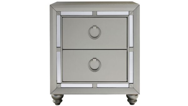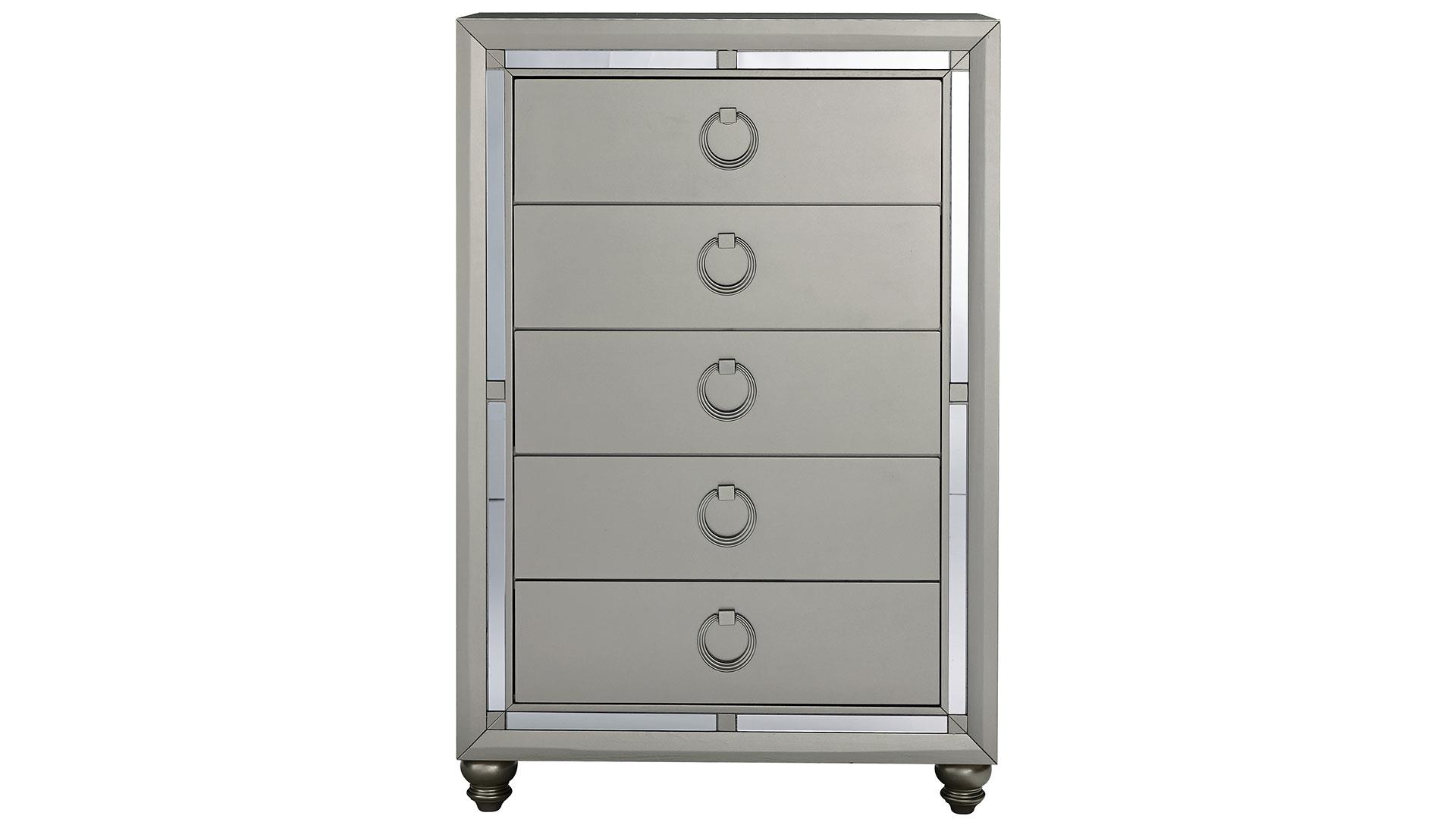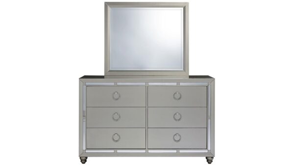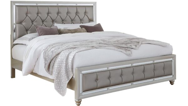 The Riley puts a contemporary spin on old-world style. The luxurious silver finish and mirror accents add sleek, ultramodern touches, while a tufted headboard and footboard echo the traditional style of upscale, craftsman made furniture.